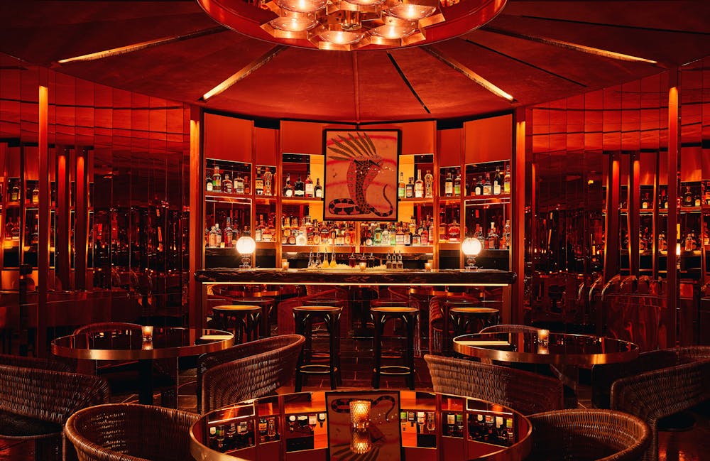 The Mirror Bar is a standalone bar within the restaurant, available for chici cocktail events or seated dinners. Dedicated bartenders shake and stir up signature cocktails behind the marble bartop adorned with vintage lamps and an impressive collection of whiskies. The oval shape of The Mirror Bar is emphasized by continuous mirrored panels around the room, creating an entrancing atmosphere. A rich velvet-covered ceiling and warm light channels keep the space inviting and alluring. Rattan pendant lights anchor two small banquettes covered in animal print-inspired fabric, opposite of a Jordan Kerwick original painting at the back bar.