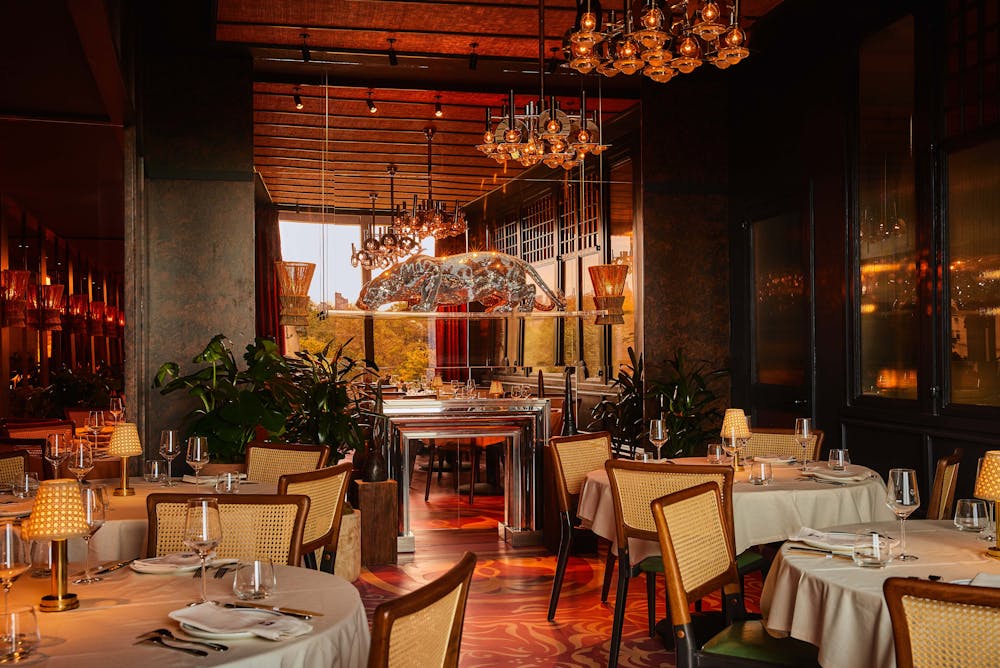 The Salon is a dedicated private event space with views overlooking Columbus Circle and Central Park. This luxe room features mirrored walls, chrome chandeliers, and a focal piece comprised of a vintage fireplace mantel and custom panther sculpture, all rooted by a signature pink floor. Warm touches of rattan and linens balance the sleek finishes with Twin Tails’ Southeast Asian identity.