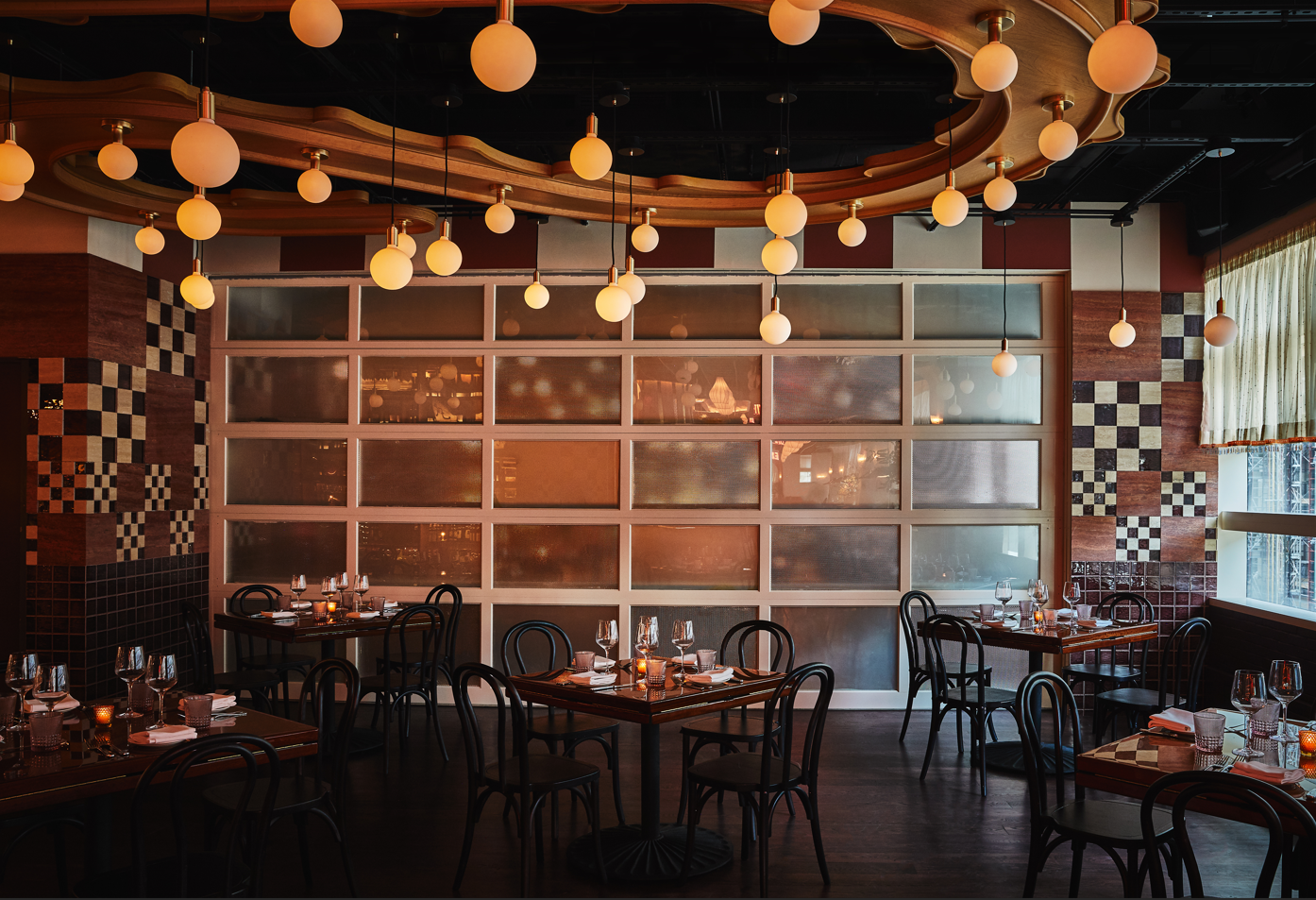The Lazzeri Room features expansive windows, a backdrop of our wine cellar, and custom tilework, all under a unique serpentine light fixture. The Lazzeri Room can be combined with The Piazza Room for larger events.